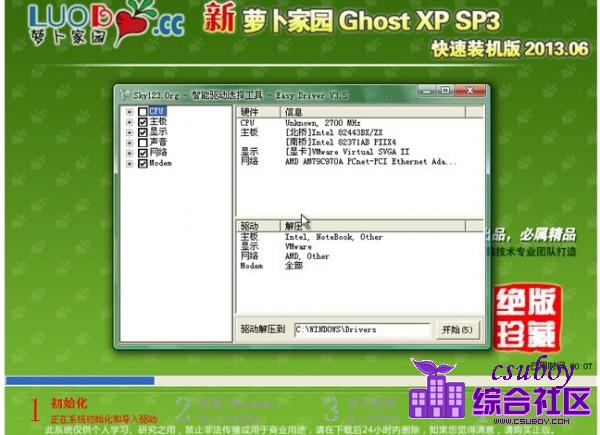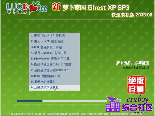 一、主要更新:========================== * 更新了系统补丁和Office2003所有补丁到2013-05-30(可通过微软漏洞扫描和卫士漏洞扫描)* 更新QQ至官方2013Beta3* 更新酷我音乐至2012官方正式版* 更新DirectX到2013.05,游戏支持性能更好* 更新Adobe Flash Player ActiveX到最新* 更新硬盘安装器,增加硬盘安装系统兼容性* 更新DOS和PE下的分区工具DiskGenius为3.5版* 增加数款驱动的支持* 其它细节的优化和修正 二、新萝卜家园系统主要特点:=====================新萝卜家园快速装机版具有更安全、更稳定、更人性化等特点。集成最常用的装机软件,集成最全面的硬件驱动,精心挑选的系统维护工具,加上新萝卜家园独有人性化的设计。是电脑城、个人、公司快速装机之首选!拥有此系统,您也可以轻松成为装机高手! ★ 更安全* 源安装盘采用Windows XP SP3官方免激活版,集成系统补丁至2013.05(可通过微软漏洞扫描)* 办公套件采用的是精简版Office2003,集成Office补丁至2013.05(可通过微软漏洞扫描)* 安装过程会自动删除各分区下可能存在的AUTORUN病毒,删除灰鸽子及磁碟机病毒。* 无新建用户帐户,仅保留Administrator,密码为空。(用户装好系统后请及时加密码) * 关闭了硬盘各分区的默认共享(如C$、D$、E$ ……),系统更安全。★ 更稳定* 包含绝大多数的SATA,SCSI,RAID控制器驱动,支持64位处理器,支持双核处理器。 * 集成了数百种常见硬件驱动,经过作者精心测试,几乎所有驱动能自动识别并安装好。* 独创全新的系统双恢复模式,解决了某些SATA光驱和有隐藏分区的电脑不能正常安装系统的问题。* 支持IDE SATA USB 光驱安装,解决了其他GHOST系统在部份SATA或有隐藏分区的电脑上无法正常恢复的问题。* 安装过程会运行自主开发的驱动选择工具,此工具可智能判断所有的电脑硬件型号,最大限度地避免了因驱动冲突而蓝屏的现象。★ 更人性化* 集成维护人员工具,不仅装机方便,维护更方便。* 预置多种精美主题、壁纸、屏保和精心收藏IE实用收藏夹。 * 智能判断电脑类型,是台式机就打开小键盘灯,是笔记本就关闭小键盘灯。* 瞬间把硬盘分成四/五个区,让每个人都懂得分区,分区不再是难事(适合新硬盘使用)。* 我的文档、收藏夹、都位于D盘。这样做可以避免下次重装系统时丢失用户个人文件。 ★ 功能增强* 优化注册表,提高系统性能。* 禁用少量服务,提高系统运行效率。* 破解连接数为1024,大大加快下载速度。* 破解uxtheme主题限制,可直接使用第三方主题。* 集成DX最新版本,MSJAVA虚拟机,VBVC常用运行库。 三、集成软件及集成方式:=====================● Internet Explorer 8● WinRAR 4.2 中文注册版● Adobe Flash Player ActiveX● Windows Media Player 10 中文版● Office 2003 SP3含Word、Excel、Powerpoint三大组件(打全补丁至2013.05)● 360安全卫士9.0● 360安全浏览器● 腾讯QQ2013Beta3官方正式版● 酷我音乐 2012 正式版● 奇艺影视● 清空大师● 系统一键备份还原 四、安装说明=====================1.光盘安装(推荐) 安装前准备: 请用刻录软件,选择 映像刻录 方式来刻录ISO文件,刻录之前请先校验一下文件的准确性,刻录速度推荐24X!请注意备份硬盘上重要资料。安装前请确认该硬盘是否需要分区,如需要,请参考以下分区方法执行分区操作后进行安装,如不需要,可直接执行安装部分分区方法: 方法一: 分区请设置光盘启动,然后选择“DiskGenius 图形分区工具”,执行分区操作,切记设置活动分区,并存盘。 方法二: 分区请设置光盘启动,然后选择“PQ 经典分区工具”,执行分区操作,切记设置活动分区。 方法三: 分区请设置光盘启动,然后选择“瞬间把硬盘分4/5区(慎用)”,进入子菜单,根据你的个人需要选择分四区还是五区,执行后续分区步骤。 安装部分:a.自动安装 方式一: 安装请设置光盘启动,然后选择“安装 GHOST XP 系统”就可以自动安装! 方式二: 安装请设置光盘启动,然后选择“安装 GHOST XP 系统”,将自动进入DOS进行安装!b.手动安装 方法一: 安装请设置光盘启动,然后选择“进入 WinPE 微型系统”进入PE后,点击“安装系统”就可以安装! 方法二: 安装请设置光盘启动,然后选择"DOS工具箱",进入带帮助信息的命令提示符状态,此时输入GHOST即可执行手动安装 方法三: 安装请设置光盘启动,然后选择“运行 Ghost 备份还原”,即可进入手动GHOST状态。 2.硬盘安装(适合无光驱或者不想浪费光盘的用户,但是需要你有一个可以使用的Windows系统) 请提取ISO中的“WINXPSP3.GHO”和“安装系统.EXE”到你的非系统分区,然后运行“安装系统.EXE”,直接回车确认还原操作,再次确认执行自动安装操作。(执行前注意备份C盘重要资料!) 五、常见问题及解决方法1、安装的时候为什么会出现读取文件错误? 这一般是由于盘片本身的问题或者刻盘出错造成的,请重新刻盘。请大家用8x,光盘一次刻录方式刻录用。另外,如果你采用的是DOS下虚拟光驱方式加载ISO再安装,也可能出现类似的情况2、为什么安装过程中会出现蓝屏或死机,或者在某些步骤(如检测硬件)时卡住? 这些情况很多是由于硬件问题造成的,如内存中某些区块损坏,或者CPU过热,或者硬盘存在坏道,或者光驱老化,读取出来的数据有问题等等。请先替换相关硬件确认是否是硬件问题造成的。3、装完后XXX驱动没有自动装好,怎么办? 如果是新显卡和最近的声卡或者比较特殊的设备(HP和联想的电脑多含这种特殊硬件),大家除了自己去下