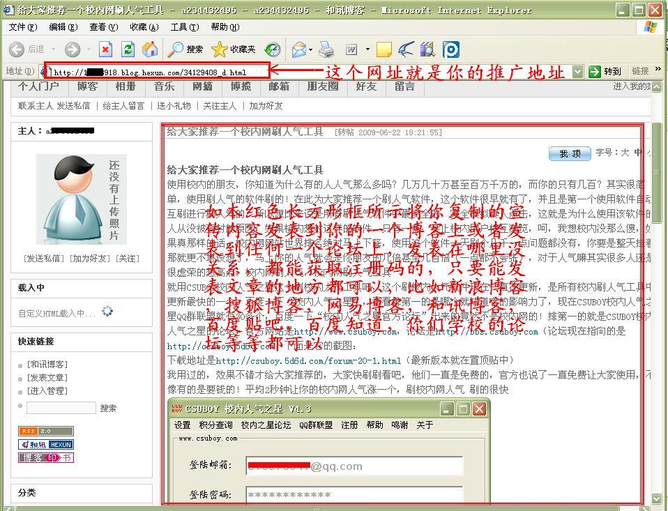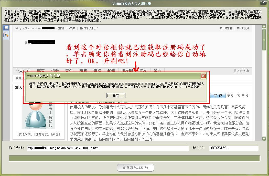 http://bbs.csuboy.com/read.php?tid=3这个帖子一楼的内容),也可以发表到其他论坛上,注意这个你发表的文章和你的校内ID是绑定的,也就是说你一旦成功获取了注册码,这个推广地址就绑定到你的校内ID上了,如果以后别人(假设A同学用了你的推广地址)再用这个推广地址注册的话直接会被我们这里的检测系统检测到,一旦我们检测出来会直接封A同学的校内ID,所以大家要使用自己的推广地址,这点要切记,不要耍小聪明,加入软件黑名单的校内ID以后将不能使用本软件,并且是永久不能使用.我们的检测系统能在半个小时之内检测完所有用户的绑定信息,发现违规的一定会严肃处理,另外提醒一下已经被加黑名单的不要再给我发邮件了,不会解封的。