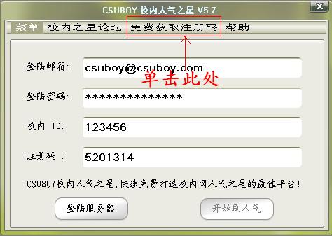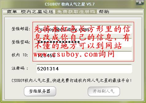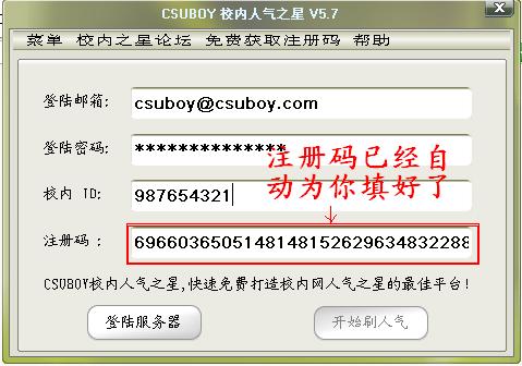 7.到此注册过程就轻轻松松结束了,什么?你还沉侵在免费获取注册码的喜悦之中?不过至此告诉你,大功一经全部告成,你以后可以永久用这个注册码来使用CSUBOY校内人气之星软件了,如下图所示(