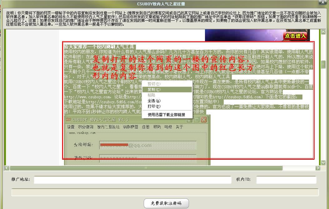 5.将你的推广地址和你的校内ID填写在软件上的相应位置。然后单击“免费获取注册码”按钮,如下图所示(