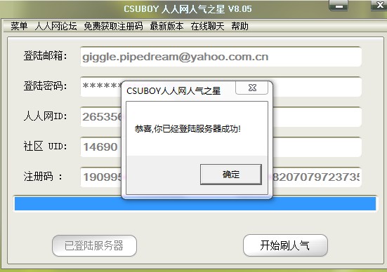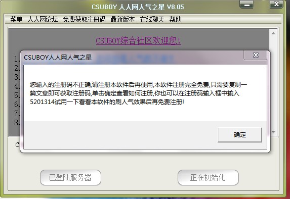 可是一点刷人气的按钮的时候就弹出来说这个注册码错误!!!让我重新复制内容到什么论坛里然后再去搞注册码!我 疯了