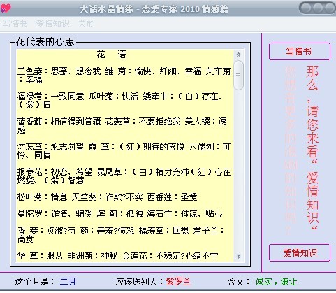 你是否暗恋一个人,是否喜欢一个人,是否疯狂地追一个人,你一定想知道自己和心中的他(她)的缘分!如果没说错的话,就赶快下载《大话水晶情缘》下来吧!它一定会给一个满意的答复!记住:两个人相遇就是一种缘分,两个人走到一起更是一种缘分!【不可不信缘】!2009新增缘分测试、帮你写情书、恋爱技巧等功能。 亲测的一份情书。如下图 亲爱的小敏: 你仿佛有一种魔力, 使我每次见到你都会感到自己的心在狂跳不止, 我知道你根本没有意识到我的存在, 但你的容颜, 已在我逐渐变冷的心中点燃了熊熊烈火, 好几次我想鼓起勇气想你表明心中的感受, 区被你那一双温柔善良眼睛压了回去, 我是如此的害怕看你的双眼, 只好把话留在心里? 我努力的强迫自己不去想你, 不要打扰你平静的生活, 尽管如此,当我闭上双眼, 你的身影又浮现在我的眼前? 我挥手让他散去, 他却纹丝不动, 我终于明白, 你对于我来说不只是一阵过眼云烟, 而是深深的印在了我的每一个角落? 在我的心中,有一件为你敞开们的小屋, 它的名字叫'爱' , 我始终把他藏在那最温暖的角落, 等待着你能住在里面我期望有一天, 你也能把你的心扉向我敞开, 不要让我的梦想一个美丽的泡泡一样破灭, 美丽的东西都是应该水灵灵的心,对吗? 让我的梦想变成现实吧! 不要让他在折磨我, 我会付出我的一切,关心你,爱护你, 让你这朵美丽的花朵,开在我心里 哪怕是有狂风暴雨,, 我的温暖都会在你身边!, 爱你的:小风 [ 此帖被chongfanearth在2010-03-12 15:53重新编辑 ]