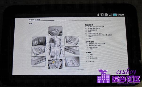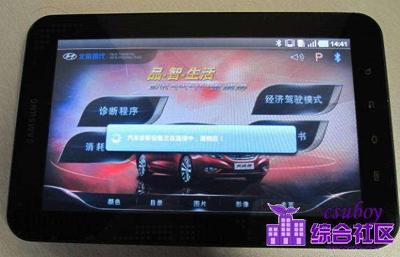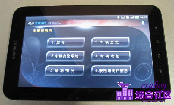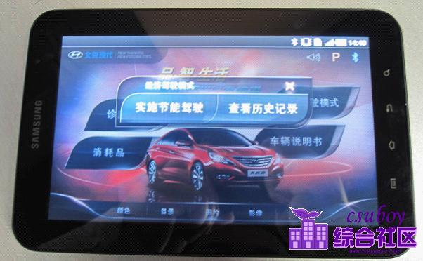 这个第八代索纳塔随车赠送的三星Galaxy Tab P1000比市场上买了多了一些功能,点击主要面中间那个按钮就会进入到上面这个页面。包含“诊断程序”“消耗品”“经济驾驶模式”“车辆说明书”四个部分。另外,还能查询第八代索纳塔的颜色、图片等等。