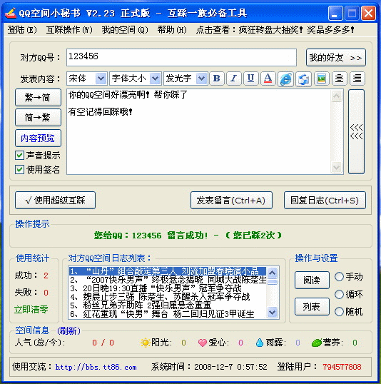 这是一款QQ空间辅助软件,您无需进入对方的QQ空间,就可以快速的给对方留言和日志评论,再也不用忍受访问慢的烦恼,而且还可以快速给您自己写日志、写心情、以及转载别人的日志。
