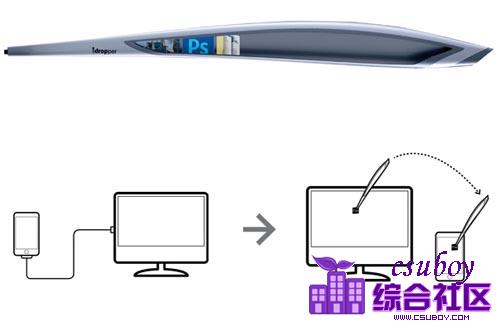iDropper是一支神奇的触控笔,它可以用来吸取信息,包括图片、文件等。顶端是操控按钮,操